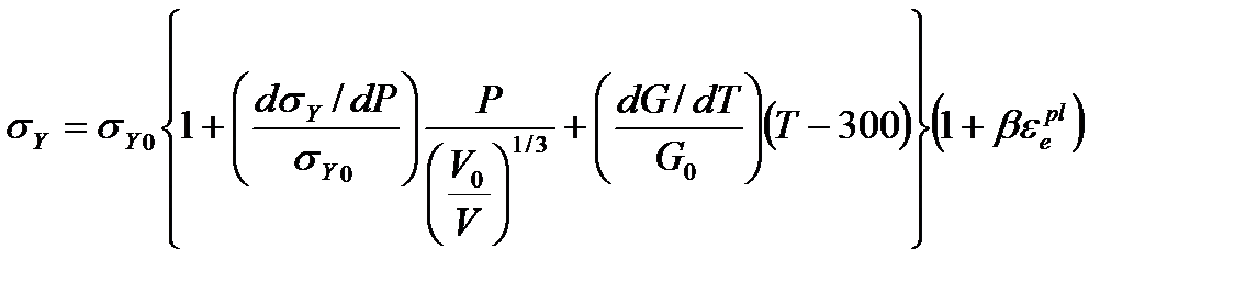 где T – температура (в градусах Кельвина); V0 – начальный объем; V – текущий объем; G0 – начальное значение модуля сдвига; σ Y0 – начальное значение предела текучести; σ Y MAX – максимальное значение предела текучести; β – константа упрочнения; dG/dP, dG/dT, d σ Y /dP, – константы материала, иногда обозначаются символом как G'P, G'T, Y'P соответственно. Если температура материала превышает температуру плавления, то значения модуля сдвига G и предела текучести σ Y обращаются в ноль.