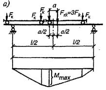 Расч усилия Ммах и Qмах в подкран балках находят от нагрузки двух сближ кранов наибольшей грузоподъемности. Т.к. нагр подвижная, то сначала надо найти такое полож ее, при кот расчетные усилия в балке будут наибольшими. Наиб изгиб мом в разрезной балке от зад сист сил возник, когда равнодейств всех сил, наход на балке, и ближ к ней сила равно удалены от середины пролета балки, при этом наиб изгиб мом Ммах будет наход под силой, ближайшей к середине пролета балки.