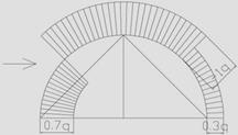 где: r – радиус закругления z – функция, заменяющая момент инерции в криволинейном брусе y – расстояние от нейтральной оси до рассматриваемой точки 22.Нагрузки, действующие на арки, схема ветровой и снеговой нагрузки, их определение. Арочные к-ции рассчитывают на верт. (собственный вес и снег) и ветровые нагрузки. Температурные воздействия для арок обычно несущественны. Верт. нагр. принадлежат к основным сочетаниям нагрузок, ветровые и температ. – к дополнительным (коэф. сочетания = 0.9). Для арок не имеющих стен ветровая нагр. принимается по упрощенной схеме: