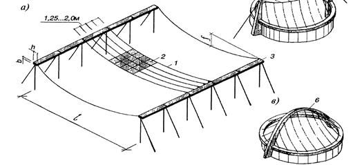 Проверьте деформативность покрытия, для чего оцените приращение стрелки провеса при действии нормативной снеговой нагрузки. Относительное значение этой стрелки не должно превышать нормируемого L / 200. Однопоясные системы с радиальными нитями: Системы с радиальными нитями применяют в зданиях круглых, реже эллиптических в плане. Для крепления нитей предусматривают наружное и внутреннее опорные кольца. По нитям, расположенным по радиусам на одинаковых расстояниях, укладывают трапециевидные железобетонные плиты. Расстояния между нитями по периметру покрытия принимают кратным шагу колонн, поддерживающих покрытие. По конструктивной форме покрытия с радиальными нитями делят на вогнутые (а), шатровые (б) и спиральные. В вогнутых покрытиях распор от нитей воспринимается кольцами, поэтому покрытие в целом является самоуравновешенной системой и на колонны передаются лишь вертикальные усилия от веса покрытия. Наружное кольцо в круглых зданиях при загружении всего покрытия равномерной нагрузкой работает только на сжатие и его рационально делать из железобетона. В шатровом покрытии внутреннее кольцо воспринимает горизонтальные силы от распора в нитях и передает на среднюю стойку всю или значительную часть вертикальной нагрузки от покрытия. Кольцо обычно опирают на центральную железобетонную опору в виде толстостенной трубы большого диаметра или на куст стоек, связанных по высоте ригелями.