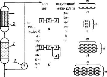 1 — реактор; 2 - теплообменник; 3— циркулярный насос; 4— резервный насос. Соединения элементов: а, в — последовательное; г — параллельное; б, д, е — смешанное