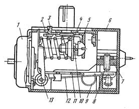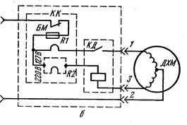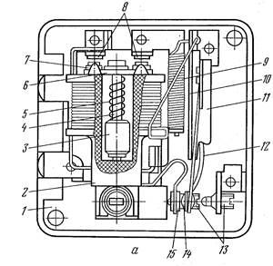 Датчик реле Т-110-1 изображен на рис. 1.3, где цифрами обозначены: 1-термосистема; 2-пружина; 3-ползун; 4-гайка; 5, 8-регулировочные винты; 6-корпус; 7-колодка; 9-перекидная пружина; 10-контровочная пружина; 11, 12-рычаги; 13-ось. Терморегулятор Т-110 смонтирован в пластмассовом корпусе (6) и состоит из следующих основных частей: термочувствительной системы, узла настройки температуры замыкания контактов, механизма переключения контактов и колодки с контактной группой, выводными клеммами и винтом настройки дифференциала. Дифференциалом в терморегуляторе называется разность между температурой замыкания и размыкания контактов (при определенном натяжении основной пружины). Чем меньше дифференциал прибора, тем в более узких пределах будет поддерживаться заданная температура. Прибор работает следующим образом. Сильфон термосистемы (1) воздействует на двуплечий рычаг, шарнирно закрепленный на оси (13). В режиме термостатирования рычаг, вращаясь под действием усилий термосистемы и пружины (2) через пружину (9) и рычаг (12) замыкает или размыкает контакты. При повышении температуры контролируемой среды контакты замыкаются, при понижении температуры на величину зоны нечувствительности размыкаются. При наиболее холодном режиме ручка повернута по часовой стрелке до упора, при среднем на 125°, а при наиболее теплом на 250° против часовой стрелки. Средний режим и режим «тепло» устанавливают по рискам на корпусе прибора. При повороте ручки против часовой стрелки до упора на 320° от наиболее холодного режима происходит принудительное размыкание контактов. Прибор устанавливается в камере холодильника под испарителем, а капиллярная трубка, припаянная к сильфону своим концом, закрепляется на стенке испарителя. При этом длинна контакта ее со стенкой должна быть не менее 120мм. Пускозащитное реле РТК-Х - токовое, комбинированное показано на рис. 1.4, где обозначено: а - конструктивная схема; 1 - корпус реле; 2 -корпус катушки; 3 - сердечник; 4 - стержень сердечника; 5 - пружина сердечника; 6 планка; 7 - подвижные контакты пускового реле; 8 неподвижные контакты пускового реле; 9 - нагреватель; 10 - биметаллическая пластина; 11- упор; 12 - контактодержатель; 13- регулировочные винты; 14- подвижный контакт защитного реле; 15- неподвижный контакт защитного реле; б – электрическая схема; ДХМ- электродвигатель; БМ- биметаллическая пластина; R-1, R-2- нагреватели; КК- тепловое реле; КД- пусковое реле.