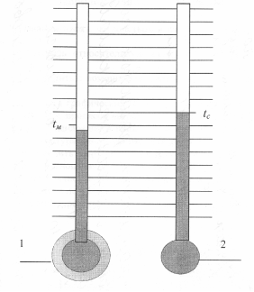 Рис. 2.4. Устройство психрометра: 1 - «мокрый» термометр; 2 - сухой термометр При работе с психрометром необходимо смочить водой ткань, покрывающую «мокрый» термометр - 1, завести часовой механизм (вентилятор при этом начинает вращаться и обдувать воздухом чувствительные элементы термометров). Сухой термометр - 2 - покажет температуру окружающего воздуха (tс), а «мокрый» - более низкую температуру (tM), так как испарение влаги с поверхности ткани, покрывающей чувствительный элемент термометра, будет приводить к его охлаждению. Для определения относительной влажности по показаниям сухого и «мокрого» термометров используется психрометрическая таблица (табл. 2.1), в которой по вертикали приведены значения температур «мокрого» термометра, а по горизонтали - разность показаний сухого и «мокрого» термометров. Величину относительной влажности