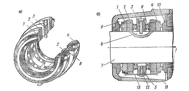 Рис. 3.8. Сальник компрессора типа V. Графитовые кольца вмонтированы в обойму 2 с резиновой основой 1. Между обоймами на валу 7 установлено еще одно кольцо 5 с гнездами для пружин 6. Для того чтобы детали сальника не проворачивались на валу, обойма фиксируется штифтом 3, нижний конец которого утопает в канавке 8, профризерованной в хвостовике вала. Нормальное, без перекосов положение колец обеспечивается планкой 13, закрепленной винтом 12. Таким образом, выход хладагенту наружу преграждают резиновые кольца1, плотно обхватывающие вал, и буртики графитовых колец 4 с притертыми поверхностями. Гнездо 8 в корпусе сальника 11 заполнено маслом, создающим своим давлением дополнительное уплотнение. Как бы совершенна ни была конструкция сальника, утечка хладагента по нему неизбежна. Считается нормальным подтекание сквозь сальник масла в виде единичных капель, но не более 5 капель в час.