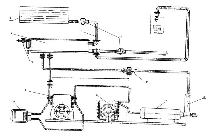 Рис. 7.2. Холодильная схема охлаждения питьевой воды. 1 – бак, 2 – трубопровод, 3 – охладитель, 4 – компрессор, 5 – реле давления, 6 - конденсатор, 7 – ресивер, 8 – фильтр, 9 – терморегулирующий вентиль, 10 – кран слива, 11 – кран спуска воздуха.