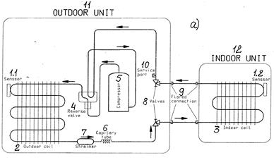 8.2. Кондиционеры модели 775 фирмы «Электра» На рис. 8.1а, б представлен кондиционер модели 775 фирмы «Электра». Цифры на рис. 1 обозначают: 1.1 и 1.2 – сенсоры или температурные датчики; 2-наружный теплообменный аппарат; 3-внутренний теплообменный аппарат; 4-реверсивный клапан; 5-компрессор; 6-капилярная трубка; 7-фильтр-осушитель; 8-угловые запорные вентили; 9-разъемные соединения на трубопроводах между наружным и внутренним блоком; 10-отверстие для обслуживания; 11-наружный блок; 12-внутренний блок. На рис. 8.1а стрелками показана циркуляция фреона, при работе кондиционера в режиме охлаждения, на рис. 8.1б – то же, при работе в режиме отопления (теплового насоса).