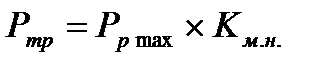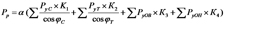 где a – коэффициент, учитывающий потери в сети в зависимости от протяженности сечения провода и т.д. (принимается равным - 1, 1); К1, К2, К3, К4 – коэффициенты спроса, зависящие от числа потребителей и учитывающие неодновременность их работы, неполную загрузку электропотребителей (принимают по справочникам); cosjc, cosjт – коэффициенты мощности, принимаемые по справочнику; Pу С – установленная мощность силовых токоприемников(кВт); Pу Т – установленная мощность технологических потребителей (кВт); Pу ОВ – установленная мощность (удельная) осветительных приборов внутреннего освещения; Pу ОН – установленная мощность (удельная) осветительных приборов наружного освещения. График электропотребления строится для выявления динамики потребления электроэнергии на строительной площадке и установления периода и величины «пиковой» нагрузки. График выполняется в линейной форме. По каждому потребителю отдельно вычерчивается линия электропотребления с указанием (над чертой) величины потребляемой мощности. Суммарное, итоговое электропотребление строится в виде диаграммы, вершина которой и является «пиковой» нагрузкой, т.е. показывает значение суммарной максимальной электрической нагрузки строительной площадки (Рр max). Потребная мощность трансформатора (кВ× А) определяется по значению рассчитанной суммарной нагрузки строительной площадки.