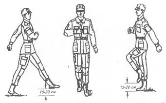 Ø Ознайомлення з прийомом. Назвати прийом і вказати, що рух здійснюється кроком або бігом.Нормальна швидкість руху кроком - 110-120 кроків за хвилину.Довжина кроку - 70-80 сантиметрів.Нормальна швидкість руху бігом - 160-180 кроків за хвилину.Довжина кроку - 80-90 сантиметрів.Крок буває стройовий і похідний.Стройовий крок застосовується під час § проходження підрозділів урочистим маршем; § при виконанні ними військового вітання під час руху; § при підході військовослужбовця до начальника та відході від нього; § при виході із строю та поверненні на місце; § занять із стройової підготовки.Похідний крок застосовується в усіх інших випадках.Вказати, що рух стройовим кроком здійснюється за командою " Стройовим кроком - РУШ ", а рух похідним кроком - за командою " Кроком - РУШ".Зразково показати як він здійснюється з поясненням. За підготовчою командою слід подати корпус трохи вперед, перенести вагу тіла більше на праву ногу, із збереженням стійкості; за виконавчою командою почати рух з лівої ноги повним кроком.Під час руху стройовим кроком ногу з витягнутим уперед носком винести на висоту 15-20 сантиметрів від землі та поставити її твердо на всю стопу, піднімаючи водночас другу ногу.Руками, починаючи від плеча, здійснювати рух біля тулуба: вперед - руки згинаються в ліктях так, щоб кисті піднімалися вище пряжки пояса на ширину долоні й на відстані долоні від тулуба до рівня ліктя; назад - до упору в плечовому суглобі. Пальці рук напівзігнуті.Під час руху стройовим кроком голову та корпус тримати прямо, дивитися вперед.Під час руху похідним кроком ногу виносити вільно, не відтягуючи носка, і ставити її на землю, як під час звичайної ходьби; руками здійснювати вільні рухи біля тулуба.Під час руху похідним кроком за командою " СТРУНКО " слід перейти на стройовий крок, а за командою " ВІЛЬНО " - на похідний крок.