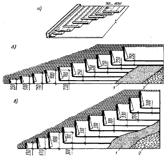 Рис. Раскладка полотнищ рулонного ковра: а — при послойном наклеивании; б — при одновременном наклеивании в четыре слоя; в — при одновременном наклеивании в три слоя; 1 - мастика; 2 — гравий Накрышах с уклоном более 15%, а также при небольших площадях крыш рулонный ковер наклеивают вручную с применением механизированного инструмента и приспособлений. При значительных объемах кровельных работ на крышах с уклоном до 15 % наклеивание рулонных материалов производят с помощью специальных наклеечных машин. Машина наносит мастику на основание или на поверхность полотнища, разматывает, укладывает и прикатывает рулонный материал, приклеивает кромки. Применение наклеечных машин позволяет механизировать процессы и операции по устройству рулонного ковра, значительно повысить производительность труда, снизить расход мастики и обеспечить высокое качество работ. 7.Технология устройства кровель из штучных материалов. Кровля из асбестоцементных изделий усиленного профиля (ВУ) и унифицированного (УВ), а также из плоских плиток. Перед укладкой листов или плиток разжелобки и карнизы, выполненные в виде сплошного деревянного настила, покрывают листовой оцинкованной сталью. Волнистые асбестоцементные листы обыкновенного профиля и средневолнистые размером 678 х 1200 мм укладывают на деревянной обрешетке из брусьев сечением 60 х 60 мм. Каждый лист должен опираться на три бруска. Для плотного прилегания листов к обрешетке и друг к другу карнизный брусок поднимают с помощью прокладок на 6 мм, а последующие четные бруски на 3 мм. Листы укладывают снизу вверх (от карниза к коньку) рядами параллельно карнизу. В рядах каждый лист должен перекрывать смежный на одну волну. Смежные ряды укладывают с нахлесткой на 120 мм при уклоне крыши более 50 % и 140 мм при уклоне 33...50 %. Плотное прилегание листов в рядах вдоль и поперек ската обеспечивают уменьшением количества слоев в нахлестке. Для этого при укладке обрезают углы двух листов или смещают перекрывающиеся кромки на одну волну. При уклоне крыши более 50 % листы укладывают насухо, а зазоры в местах нахлестки заделывают со стороны чердака цементно-песчаным раствором с волокнистым наполнителем. При меньшем уклоне в местах нахлестки листы укладывают на слой битумно-эмульсионной мастики, которую применяют и при устройстве мастичных кровель. Листы крепят к обрешетке нержавеющими гвоздями или шурупами с мягкими шайбами. Отверстия в местах для гвоздей и шурупов просверливают в гребнях волн заранее или в процессе работы ручной дрелью или электрической. Каждый лист карнизного ряда крепят тремя гвоздями: двумя — вторую волну от края со стороны нахлестки и одним — четвертую волну к карнизному брусу. Крайние листы последующих рядов крепят двумя гвоздями, а рядовые — одним гвоздем во вторую волну. На коньковом брусе через 2 м закрепляют крючья для навешивания ходовых мостиков. Ребра и конек крыши покрывают коньковыми деталями. Примыкания к вертикальным поверхностям закрывают асбестоцементными уголками или металлическими фартуками. Листы усиленного и унифицированного профилей (размерами от 994 х 1750 до 944 х 2800 и от 1125 X 1750 до 1125 х 3300 мм) используют для покрытия промышленных зданий с уклоном крыши более 25 %. Их укладывают по доскам обрешетки, закрепляемой на железобетонных плитах покрытия, или по деревянным плитам покрыт