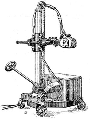 Рис.15 Установка позволяет поднимать и опускать источник излучения над столом за счет работы подвижного кронштейна. Время экспозиции подбирают по специальным графикам, аналогичных ранее рассмотренным (рис. 10). Другим типом оборудования для просвечивания рентгеновскими лучами, стали кольцевые ускорители электронов – бетатроны. Работа бетатрона принципиально аналогична работе рентгеновских установок и отличается только системой ускорения электронов. Известно, что переменное магнитное поле способствует возникновению в зоне своего действия вихревых электрических полей. В зависимости от частоты изменения направления магнитного потока изменяется и напряженность электрического поля, имеющего в бетатроне форму окружности, расположенной перпендикулярно направлению магнитного потока (рис. 16, 1). Поскольку напряженность на всей окружности кольцевой вакуумной камеры -1 электрического поля одинакова, электрон, попавший на эту окружность, за один полный оборот приобретает энергию, равную произведению длины окружности на заряд электрона и на напряженность электрического поля.