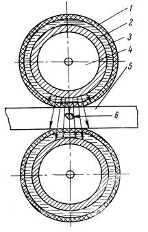 В некоторых случаях для контроля листовых заготовок теневым методом, используют системы кольцевых искательных головок, схема одной пары которых представлена на рисунке 23. Каждый кольцевой преобразователь излучающей и принимающей систем состоят из: резиновой оболочки – 1; кольца из титаната бария – 2, жидкости, обеспечивающей акустический контакт – 3 и корпуса – 4 из плексиглаза.