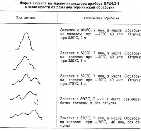 Из данных осциллограмм видно, что температура отпуска закаленной стали сильно влияет на форму сигнала, а это дает возможность оценить правильность выполнения режимов термической обработки сталей. Кроме вышеназванного прибора, в промышленности широко используются и другие марко приборов: ЭМИД-8, ВС-10П, ИЭ и многие другие.