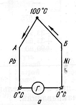 Природа возникновения ЭДС при контактной разности потенциалов U заключается в том, что при соприкосновении двух металлических пластин, изготовленных из различных металлов, например, Pb и Ni, которые имеют различные значения энергии Ферми W1 и W2 и работы выхода электронов φ 1 и φ 2, при температуре выше абсолютного нуля, из одной пластины в другую через зону контакта начнет перемещаться в определенном направлении некоторое количество электронов (от Ni к Pb) в соотношении, зависящим от значений φ 1 и φ 2. Плотность потока электронов через точку контакта зависит от соотношения их потенциалов W и полной Е энергий: Е0 = Е + Ws, где Е – кинетическая энергия электронов, а Ws = W1 – W2 – разность потенциальной энергии электронов в обеих пластинах. Известны три эффекта, обуславливающих явление термоэлектричества: Зеебека, Пельтье и Томсона. Эффект Зеебека, используемый в термоэлектрическом контроле сплавов, состоит в следующем. Если две проволочки из, например, свинца и никеля соединить в контур (рис. 47а) и место контакта (спая) нагреть до 1000С, в контуре потечет ток, который можно зарегистрировать гальванометром. Величина этого тока будет зависеть от природы материалов проволок и температуры на двух концах – холодного у гальванометра (00С) и горячего – у спая (1000С). Все химические элементы - металлы по величине и знаку термоэлектродвижущей силы располагаются в ряд: Bi, Co, Ni, Pd, Al, Mg, Pb, Sn, Zn, Fe. При этом каждый впереди стоящий металл положителен по отношению к последующему металлу. Контур, образованный двумя проволоками из различных металлов или сплавов, называется термопарой. Термопары широко используется практике измерения как низких, так и высоких температур. Зависимость термоЭДС контура от температуры спаев выражается формулой: Е = а t + b t 2 + c t 3, где Е – термоЭДС, мкВ, t – температура, 0С. а, b, c – величины, характеризующие физическую природу материалов. В ниже расположенной таблице приведены значения термоЭДС (т.э.д.с.) для пар электродов, один из которых – платина, а другой – один из ряда различных металлов.