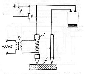 Термоэлектрический метод основан на эффектах, связанных с возникновением в металлах термоэлектродвижущей силы. ТермоЭДС возникает в месте контакта между нагретым до определенной температуры металлом (электродом) и металлическим объектом контроля, температура которого отличается от температуры электрода. Рис. 47