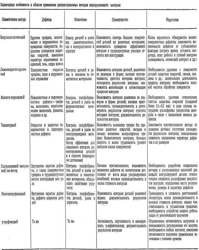 Из таблицы следует, что для выявления внутренних дефектов в изделиях наиболее приемлемым будет ультразвуковой метод, а для диагностики поверхностных дефектов наибольшей чувствительностью обладает магнитный люминесцентный метод. Однако у каждого метода контроля имеются как определенные достоинства, так и недостатки, характеристика которых приведена в следующей таблице.