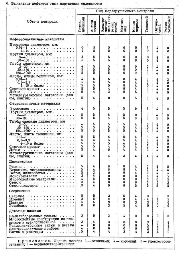 Если оценить каждый метод по 5 – ти бальной шкале применимости для выявления определенных дефектов в разнообразных изделиях и заготовках, то, в качестве примера, существуют технологические данные, приводимые в следующей таблице 6.