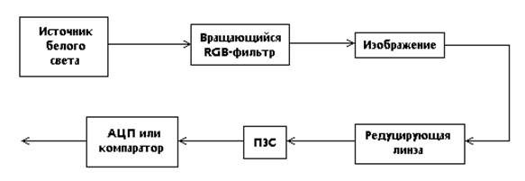 Рис.3. Блок-схема сканера з dichroic-фільтрами. Фізика роботи подібних фільтрів зв'язана з явищем діхроизма, що полягає в різному фарбуванні одноосьових кристалів у минаючому білому світлі в залежності від положення оптичної осі. У розглянутому випадку фільтрація здійснюється парою таких фільтрів, кожний з який являє собою «сендвіч» із двох тонких і одного більш товстого шару кристалів.