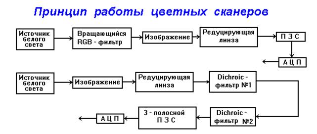 В даний час існує кілька технологій для одержання кольорових скануємих зображень. Один з найбільш загальних принципів роботи кольорового сканера полягає в наступному. скануєме зображення висвітлюється вже не білим кольором, а через обертовий RGB-світлофільтр (мал. 2). Для кожного з основних квітів (червоного, зеленого і синього) послідовність операцій практично не відрізняється від послідовності дій при скануванні чорно-білого зображення. Виключення складає, мабуть, тільки етап попередньої обробки і гамма-корекції квітів, перед тим як інформація передається в комп'ютер. Зрозуміло, що цей етап є загальним для всіх кольорових сканерів. У результаті трьох проходів сканування виходить файл, що містить образ зображення в трьох основних квітах — RGB (образ композитного сигналу). Якщо використовується восьмирозрядний АЦП, що підтримує 256 відтінків для одного кольору, то кожній крапці зображення ставиться у відповідність один з 16, 7 мільйона можливих квітів (24 розряду). Сканери, що використовують подібний принцип дії, випускаються, наприклад, фірмою Microtek. Треба відзначити, що найбільш істотним недоліком описаного вище методу є збільшення часу сканування в три рази. Проблему може представляти також «вирівнювання» пікселів при кожнім із трьох проходів, тому що в противному випадку можливе розмивання відтінків і «змазування» квітів. У сканерах відомих японських фірм Epson і Sharp, як правило, замість одного джерела світла використовується три, для кожного кольору окремо. Це дозволяє сканувати зображення усього за один прохід і виключає невірне «вирівнювання» пікселів. Складності цього методу полягають звичайно в підборі джерел світла зі стабільними характеристиками. Інша японська фірма — Seiko Instruments — розробила Кольоровий планшетний сканер SpectraPoint, у якому елементи ПЗЗ були замінені фототранзисторами. На ширині 8, 5 дюйма розміщено 10200 фототранзисторів, розташованих у три стовпчики по 3400 у кожній. Три кольорових фільтри (RGB) улаштовані так, що кожен стовпчик фототранзисторів сприймає тільки один основний колір. Висока щільність інтегральних фототранзисторів дозволяє досягати гарної здатності, що дозволяє — 400 dpi (3400/8, 5) — без використання лінзи, що редукує. Принцип дії кольорового сканера ScanJet Iic фірми Hewlett Packard трохи інший. Джерело білого світла висвітлює скануєме зображення, а відбите світло через лінзу, що редукує, попадає на трьох полосну ПЗЗ через систему спеціальних фільтрів, що і розділяють біле світло на три компоненти: червоний, зелений і синій (мал. 3). Фізика роботи подібних фільтрів зв'язана з явищем діхроизма, що полягає в різному фарбуванні одноосьових кристалів у минаючому білому світлі в залежності від положення оптичної осі. У розглянутому випадку фільтрація здійснюється парою таких фільтрів, кожний з який являє собою «сендвіч» із двох тонких і одного більш товстого шару кристалів. Перший шар першого фільтра відбиває синє світло, але пропускає зелений і червоний. Другий шар відбиває зелене світло і пропускає червоний, котрий відбивається тільки від третього шару. В другому фільтрі, навпаки, від першого шару відбивається червоне світло, від другого — зелений, а від третього — синій. Після системи фільтрів розділене червоне, зелене і синє світло попадає на власну смугу ПЗЗ, кожен елемент якого має розмір близько 8 мкм.