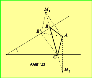 Розв’язання. Нехай задана точка всередині кута . Симетризуючи її відносно сторін кута, отримаємо точки та . Проведемо пряму , яка перетне сторони кута у деяких точках та (рис. 22). Покажемо, що трикутник - шуканий.