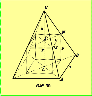 Розв’язання. Нехай правильна чотирикутна призма вписана в піраміду так, як показано на рисунку 30. Нехай сторона основи призми дорівнює , а її висота .З подібності трикутників та отримуємо , а з подібності трикутників та випливає співвідношення . З пропорції знаходимо . Оскільки площа бічної поверхні призми дорівнює , то маємо .