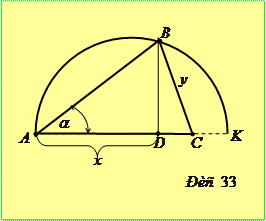 Розв’язання. Нехай шуканим є трикутник і , , (рис. 33), - радіус заданого півкола з діаметром .Проведемо . Нехай . Тоді і . Тепер знаходимо, що . З прямокутного трикутника отримуємо , а із рівнобедреного трикутника за теоремою косинусів маємо .