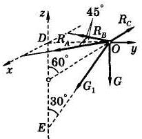 х: RA sin 45° – RB sin 45° = 0; у: – RA cos 45° – RB cos 45° + RС sin 60° – G sin 30° = 0; z: RС cos60о – G 1cos30° – G = 0.