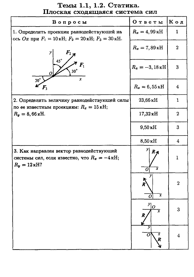 1.Сущность аксиом статики. 2.Cущность принципа освобождаемости от связей. 3.Виды связей и их реакции. 4. Дайте определение системы сходящихся сил. 5. Как найти равнодействующую системы сходящихся сил графическим методом? 6. Как определить равнодействующую системы сходящихся сил аналитическим методом? 7. Сформулируйте условия равновесия системы сходящихся сил. 8. Сущность теоремы о трех непараллельных силах.