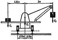 Пример 1. Определить вес противовеса G 1, обеспечивающий коэффициент устойчивости нагруженного крана при опрокидывании, равный 1, 5, если вес крана G 2=50 кН, вес груза G 3=40 кН. Размеры указаны на рисунок 129. Р е ш е н и е. Предполагаемое опрокидывание крана под действием веса груза G3 является вращением вокруг оси О, совпадающей с правым рельсом. Силами, препятствующими опрокидыванию, являются вес крана