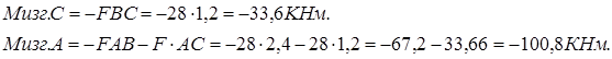 ∑ Fy=0 ∑ MA=0 ∑ y=-=-F-F+RA=0 RA=2F=2·2800=5600 кг ∑ Mр=FAB+FAC=2800·2, 4+2800·1, 2=10080 кг=10, 08 т=100, 8 kH·м ∑ МВ=RA·AB-Mp-F·CB=0 ∑ MB=5600·2, 4-10080-2800·1, 2=13440-10080-3360=0