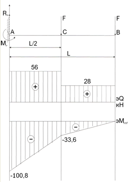 R=2F+ql=2·28+0, 554·2, 4=56+1, 3296=57, 33кН Mp=F·l+Fl/2+ Определяем поперечную силу, строим эпюру