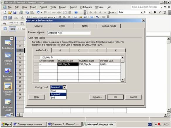 При планировании стоимости проекта необходимо определить режим расходования бюджета на протяжении проекта. Для этого надо назначить порядок или способ оплаты работ. Способы оплаты работ могут быть следующие: · предоплата, · оплата по факту завершения работ, · оплата по мере выполнения работ. Способы оплаты могут задаваться. Для указания способа оплаты нужно выбрать вкладку Cost (Затраты) в окне Resource Information (Информация о ресурсе)и сделать назначение в списке Cost Accrual (Начисление затрат): · Start (Оплата в начале проекта), · End (Оплата по окончании проекта), · Prorated (Пропорциональная оплата в период проекта).