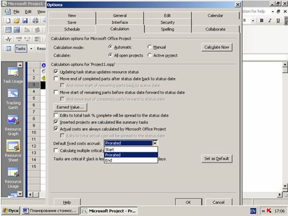 Метод начисления фиксированных затрат указывается в поле Fixed Cost Accrual (Начисление фиксированных затрат) для каждой задачи. По умолчанию – в списке Default Fixed Cost Accrual на вкладке Calculation в окне Tools/Options.