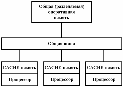 Рис. 1.2: Схема архитектуры MPP системы Однако есть и решающий “минус”, сводящий многие “плюсы” на нет. Дело в том, что межпроцессорное взаимодействие в компьютерах этого класса идет намного медленнее, чем происходит локальная обработка данных самими процессорами. Именно поэтому написать эффективную программу для таких компьютеров очень сложно, а для некоторых алгоритмов – иногда просто невозможно. К этому же классу можно отнести и сети компьютеров, которые все чаще рассматривают как дешевую альтернативу крайне дорогим суперкомпьютерам. Компьютеры с общей памятью (SMP системы). Вся оперативная память таких компьютеров разделяется несколькими одинаковыми процессорами (рис. 1.3). Это снимает проблемы предыдущего класса, но добавляет новые – число процессоров, имеющих доступ к общей памяти, по чисто техническим причинам нельзя сделать большим.