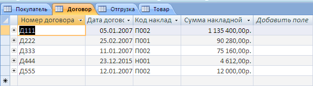 Наполненная данными таблица «Договор» Показано на рис.5.