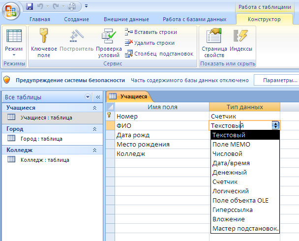 Тольятти 2015 Содержание 1. Введение 2 2. Ход выполнения работы 4 3. Заключение 8 Введение. Целью работы является приобретение навыков наполнения таблиц БД данными, используя следующие типы данных: 1.Текстовый; 2.Числовой (Процентный, Денежный, Одинарный с плавающей точкой, с заданием условия и сообщением об ошибке); 3.Объект OLE; 4.Логический тип поля; 5.Гиперссылка; 6.Memo.