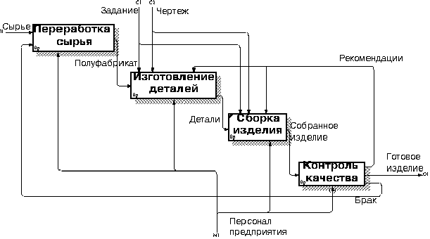 Рис.4 Диаграмма декомпозиции. Для рисования внутренней стрелки необходимо в режиме рисования стрелок кликнуть по сегменту (например выхода) одной работы и затем по сегменту (например входа) другой. В IDEF0 различают пять типов связей работ: 1. прямая связь по входу, когда стрелка выхода вышестоящей (далее просто выход) работы направляется на вход нижестоящей (например, на рисунке стрелка " Детали" связывает работы " Изготовление деталей" и " Сборка деталей"); 2. прямая связь по управлению, когда выход вышестоящей работы направляется на управление нижестоящей; 3. обратная связь по входу, когда выход нижестоящей работы направляется на вход вышестоящей (стрелка " Брак"); 4. обратная связь по управлению, когда выход нижестоящей работы направляется на управление вышестоящей (стрелка " Рекомендации"); 5. связь выход-механизм, когда выход одной работы направляется на механизм другой. Вновь внесенные граничные стрелки на диаграмме декомпозиции нижнего уровня изображаются в квадратных скобках и автоматически не появляются на диаграмме верхнего уровня. Для их " перетаскивания" наверх нужно сначала выбрать кнопку