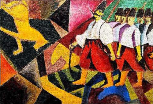 Український авангардизм мав на меті сформувати естетичні засади мистецтва майбутнього на основі національних традицій, ідей, тематики. Першими струмінь авангардизму внесли в український культурний простір В. Іздебський та В. Кандинський, котрі в 1909–1911 рр. організували відомі одеські мистецькі “Салони”. Тут збиралися брати Давид, Володимир та Микола Бурлюки, І. Білібін, Г. Нарбут, О. Екстер та ін. Творчою оригінальністю вирізняється діяльність художника-авангардиста, поета, теоретика і критика мистецтва Д. Бурлюка, в якій спостерігаємо властиву українському модернізмові ідею синтезу етнокультурного та світового потенціалу. Навіть на еміграції, де мешкав 45 років, він не поривав з Україною. Багато його творів пронизані національним духом: “Святослав”, “Козак Мамай”, портрет Т. Шевченка. Один з американських мистецтвознавців К. Брінтон називав Д. Бурлюка впертим козаком з величезним серцем, що жив, мов гоголівський Тарас Бульба. (Рис. 2)