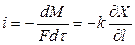 В начальный момент времени При удалении свободной поверхностной влаги температура материала не меняется и равна температуре мокрого термометра, а давление паров над материалом равно давлению насыщенных паров жидкости. В этот период влага удаляется из твердого материала при постоянной скорости. С течением времени концентрация вещества в твердом теле непрерывно снижается, принимая значения Удаление влаги происходит не только в продвигающейся внутрь тела поверхности испарения с переменной координатой В период уменьшения скорости общая скорость массопереноса будет определяться скоростью перемещения общего массового потока вещества от поверхности испарения к поверхности тела, т. е. скоростью массопроводности, которая определяется механизмом массопереноса. Процесс массопроводности описывается уравнением, аналогичным закону Фика (Фурье),