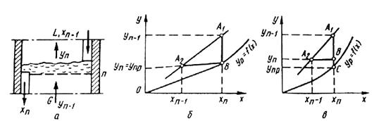 Рис.12.10. Схема массообмена на тарелке (а) и изображение процесса в координатах y-x (б) – в условиях достижения равновесия на тарелке – идеальный процесс; в – в условиях недостижения равновесия на тарелке – реальный процесс