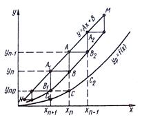 Рис. 12.11. К определению числа ступеней изменения концентраций методом построения кинетической линии