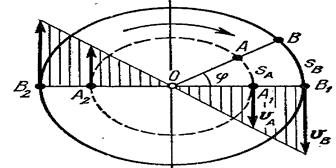 Розрізняють два види найпростіших рухів твердого тіла: поступальний і обертальний навколо нерухомої осі. Рух тіла, під час якого будь-яка пряма, проведена в тілі, залишається паралельною сама собі, називають поступальним. Уявлення про поступальний рух можна скласти, спостерігаючи рух вагона трамвая на прямолінійній ділянці шляху; поступально рухається стіл поздовж ньостругального верстата, поршень стаціонарного двигуна внутрішнього згоряння тощо. Теорема. У поступальному русі усі точки мають однакові траєкторії, швидкості і прискорення. Обертання навколо нерухомої осі Рух, при якому хоча б дві точки твердого тіла чи незмінної системи залишаються нерухомими, називається обертальним; пряма, яка сполучає ці дві точки, називається віссю обертання.В означенні обертального руху йдеться про незмінну систему, тому вісь обертання може бути й за межами тіла. Обертальний рух у техніці — явище дуже поширене. Переважна більшість механізмів і машин мають ланки, які рухаються обертально, наприклад вали, зубчасті колеса, кривошипи тощо. Зазначимо, що поняття обертального руху може стосуватися лише тіла, але не точки; так, наприклад, рух точки по колу — не обертальний рух, а криволінійний. Розглянемо диск, який обертається навколо осі, перпендикулярної до рисунка 10.3. Точка О — слід цієї осі. Очевидно, що траєкторії точок обертового тіла є кола різних радіусів, розміщені в площинах, перпендикулярних до осі обертання, з центрами, що лежать на пій осі. Рис. Ю.З Нехай за час t диск повернувся на кут ф. При цьому точка А пройшла шлях sa, а точка В — шлях sв. Оскільки точки, що містяться на різних відстанях від осі обертання, за той самий проміжок часу проходять різні шляхи, то вони мають різні швидкості і прискорення. Отже, під час обертального руху тіла його точки, що містяться на різних відстанях від осі обертання, мають неоднакові траєкторії, швидкості і прискорення. Звідси виходить, що лінійне переміщення (шлях), лінійна швидкість і прискорення не можуть характеризувати обертальний рух тіла в цілому. Обертальний рух тіла можна характеризувати кутом ф, на який воно повертається за даний проміжок часу. Цей кут називають кутовим переміщенням тіла. Кутове переміщення виражають у радіанах (рад) або обертах (об); в останньому випадку кутове переміщення позначають N. Щоб установити залежність між кутом ф і Nf складемо пропорцію: 1 об — 2я рад, N об — ф рад, звідки
