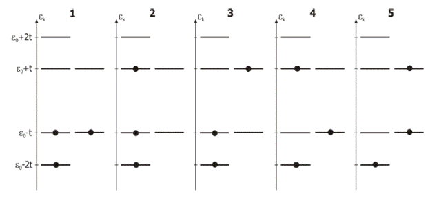 Рис.13. Основное (1) и первое возбуждённое (2-5) состояния для системы из трёх частиц на шести узлах. Значит, одна частица должна разместиться на нижнем, в две другие – на втором и третьем энергетическом уровнях. Полная же энергия основного состояния рассматриваемой системы должна быть равна: