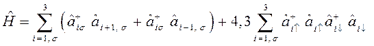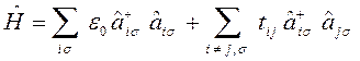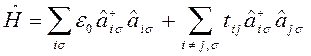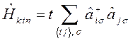Здесь первый член гамильтониана (кинетическая энергия) описывает перескоки электронов на соседние узлы с амплитудой