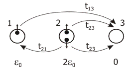 Рис.9. Матричные элементы потенциальной и кинетической энергий для гамильтониана в случае системы из трёх узлов и трёх электронов. Эта амплитуда, согласно формализму вторичного квантования, является матричным элементом оператора кинетической энергии: