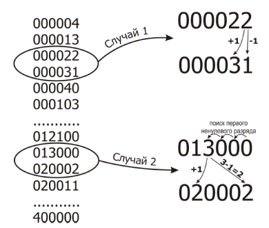 По этой причине достаточно важным оказывается вопрос поиска необходимого состояния при формировании гамильтоновой матрицы. Для этого требуется сразу формировать базис, упорядоченный по числам заполнения, в котором можно организовать эффективную процедуру поиска нужного состояния, например, методом деления отрезка пополам. Рассмотрим алгоритм формирования узельного базиса. Пусть требуется сформировать два узельных базиса – один для системы, состоящей из шесть узлов и четырёх частиц с бозе-статистикой, а другой – для той же системы и частиц с ферми-статистикой без учёта спина. Так, первое состояние некоторой системы (кластера) формируется размещением всех частиц на последнем узле Случай 1: Если на последнем узле находятся одна или более частиц. В этом случае на предпоследний узел добавляется одна частица, а с последнего узла убирается одна частица. Случай 2: Если на последнем узле нет частиц. В этом случае производится поиск узла, ближайшего к последнему, на котором есть частицы. После этого на узел, расположенный слева от найденного, добавляется одна частица, а на последний узел помещаются все оставшиеся на найденном узле частицы.