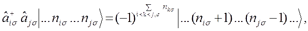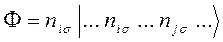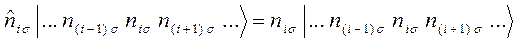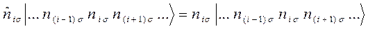 В этом случае можно показать, что гамильтониан Хаббарда будет эквивалентен гейзенберговскому антиферромагнитному гамильтониану, который был рассмотрен уже ранее и в общем случае может быть использован при изучении спиновой статистики. Из-за сложности аналитического описания в последнее время применяются численные расчёты этих моделей, в частности, методы Монте-Карло и методы точной диагонализации. 3.6.1. Гамильтонова матрица модели Хаббарда и её расширенных аналогов. Целью данного раздела является формулировка численной задачи для нахождения спектра модели Хаббарда. Рассмотрим действие оператора под знаком суммы в кулоновской части гамильтониана Хаббарда: