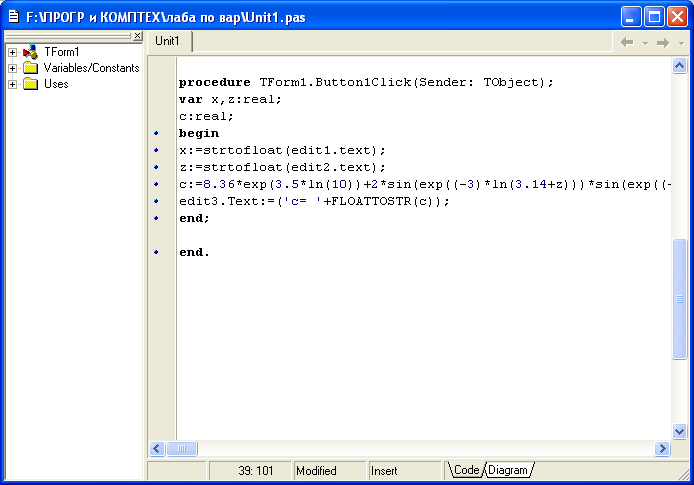 procedure TForm1.Button1Click(Sender: TObject); var x, z: real; c: real; begin x: =strtofloat(edit1.text); z: =strtofloat(edit2.text); c: =8.36*exp(3.5*ln(10))+2*sin(exp((-3)*ln(3.14+z)))*sin(exp((-3)*ln(3.14+z)))+exp(ln(abs(x))/2)*(sin(sqr(x)))/(x+exp(x))-(cos(abs(x/2)))/(sin(abs(x/2))); edit3.Text: =('c= '+FLOATTOSTR(c)); end;
