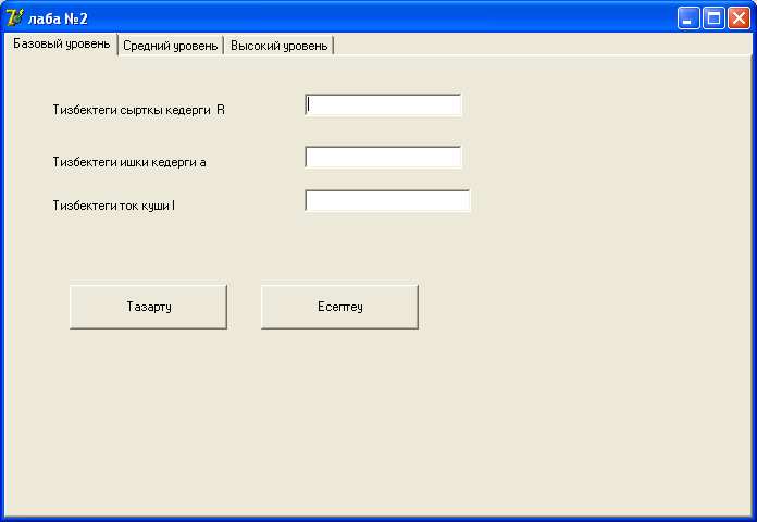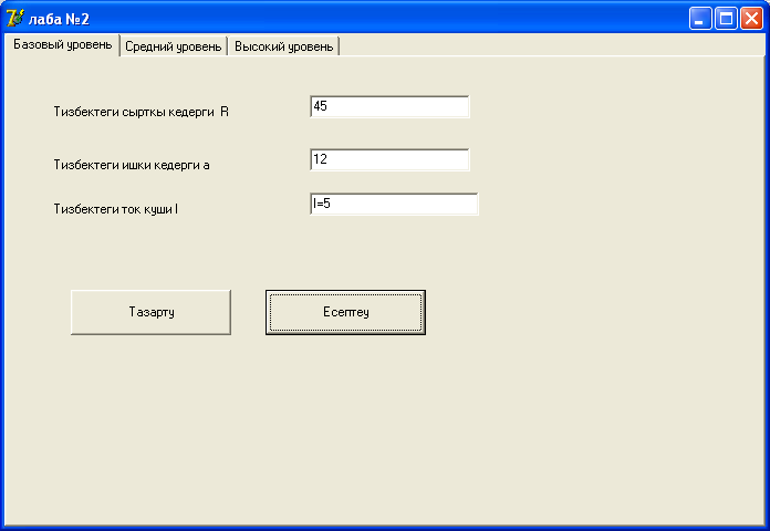 Тақ ырыбы: Сызық ты қ ұ рылымды алгоритмді зерттеу. Визуалды компоненттер. Жұ мыстың мақ саты: «Standard» жә не «Win32» қ осымша парақ тың визуалды компоненттерін зерттеу. Сызық ты қ ұ рылымды алгоритмді орындау ү шін терезелі интерфейсті қ осымшаны жасау. Берілгендер: а) Тұ йық талғ ан тізбек ү шін ток кү шінің мә нін есептеп табу: мұ ндағ ы:
