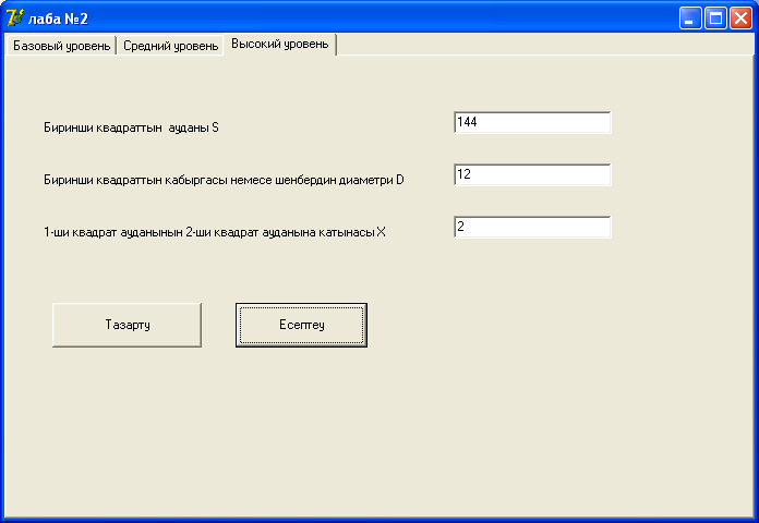 б) Алгоритмнің қ ұ рылымды схемасын жә не функцияны есептеу программасының жобасын қ ұ ру.Бастапқ ы берілгендерді пернетақ тадан енгізу, нә тижесін экранғ а шығ ару. Шең бер ауданы берілген квадратқ а іштей сызылғ ан. Осы шең берге іштей сызылғ ан квадрат ауданын табу керек. Іштей сызылғ ан квалрат ауданы ауданы берілген квадрат ауданынан неше есе кіші? Бірінші квадраттың ауданы S=144 м2; Бірінші квадраттың қ абырғ асы немесе шең бер диаметрі D=12 м.