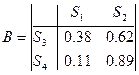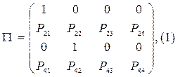 В данном случае компоненты вектора В конкретных задачах, конечно, более информативным результатом будет не количество шагов, а какие-либо временные или экономические показатели. Этот результат легко получить, если связать пребывание в каждом состоянии с соответствующими характеристиками. Очевидно, набор этих характеристик составит вектор, на который нужно умножить Так, если задать в нашем примере время пребывания в состоянии S2 - t2 = 20 час, а в состоянии S3 - t3 = 30 час, то общее время до поглощения будет равно: В случаях, когда Марковская цепь включает несколько поглощающих состояний, возникают такие вопросы: в какое из поглощающих состояний цепь попадет раньше (или позже); в каких из них процесс будет останавливаться чаще, а в каких - реже? Оказывается, ответ на эти вопросы легко получить, если снова воспользоваться фундаментальной матрицей. Обозначим через bij вероятность того, что процесс завершится в некотором поглощающем состоянии Sj при условии, что начальным было состояние Si. Множество состояний bij снова снова образует матрицу, строки которой соответствуют невозвратным состояниям, а столбцы - всем поглощающим состояниям. В теории дискретных Марковских процессов доказывается, что матрица В определяется следующим образом: М - фундаментальная матрица с размерностью S; R - блок фундаментальной матрицы с размерностью r. Рассмотрим конкретный пример системы с четырьмя состояниями S1- S4, две из которых - S1, S2 - поглощающие, а две - невозвратные: S3 и S4. P11 = P22 = 1; P31 = P43 = q; P34 = P42 = P. Остальные значения вероятностей будут нулевыми. Каноническая форма матрицы перехода в этом случае будет выглядеть так: Фундаментальная матрица после вычислений примет вид: Тогда, согласно формуле (7), матрица вероятностей поглощения вычисляется так: Поясним вероятностный смысл полученной матрицы с помощью конкретных чисел. Пусть p = 0, 7, а q = 0, 3. Тогда, после подстановки полученных значений в матрицу В, получим: Таким образом, если процесс начался в S3, то вероятность попадания его в S1 равна 0, 38, а в S2 - 0, 62. Отметим одно интересное обстоятельство: несмотря на то, что, казалось бы, левое поглощающее состояние (" левая яма") находится рядом с S3, но вероятность попадания в нее почти в два раза меньше, чем в " удаленную яму" - S2. Этот интересный факт подмечен в теории дискретных Марковских процессов и объясняется он тем, что p> q, то есть процесс имеет как бы " правый уклон". Рассмотренная выше модель называется в теории дискретных Марковских процессов моделью случайного блуждания. Такими моделями часто объясняются многие физические и технические явления и даже поведение игроков во время различных игр. В частности, в рассмотренном примере объясняется факт того, что более сильный игрок может дать заранее значительное преимущество (" фору") слабому противнику и все равно его шансы на выигрыш будут более предпочтительными. Кроме указанных выше средних характеристик вероятностного процесса с помощью фундаментальной матрицы можно вычислить моменты и более высоких порядков. В частности, дисперсия числа пребывания в том или ином состоянии - D определяется с помощью следующей матрицы: